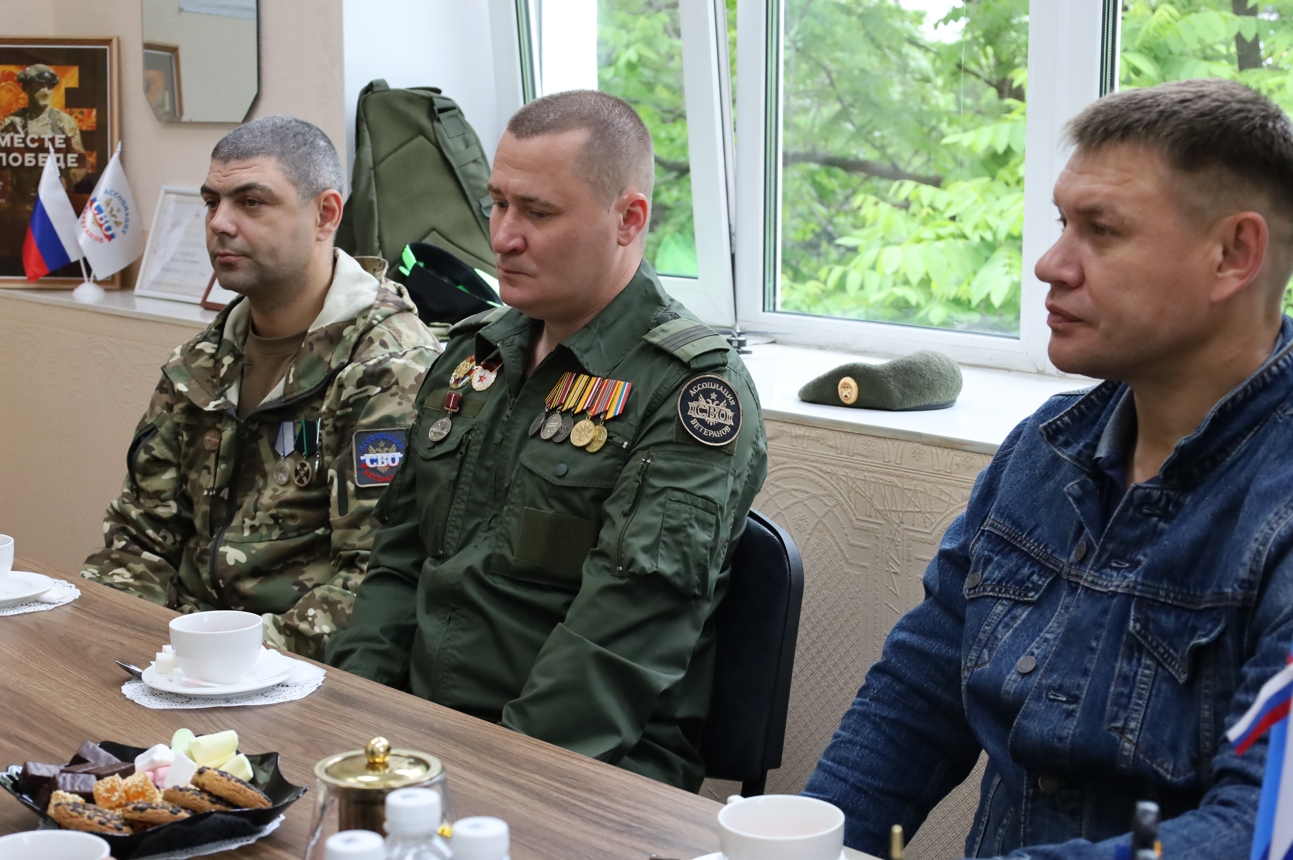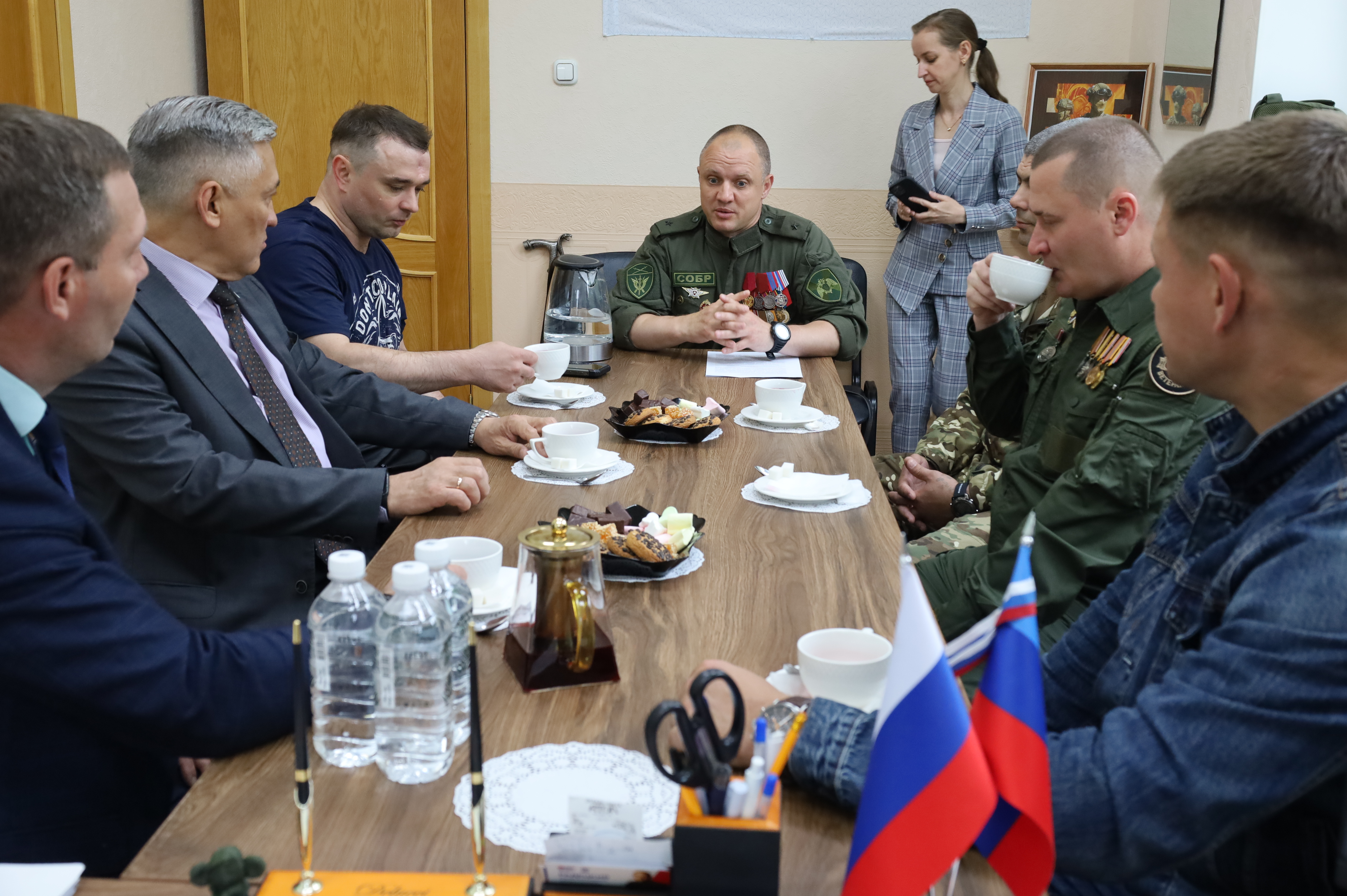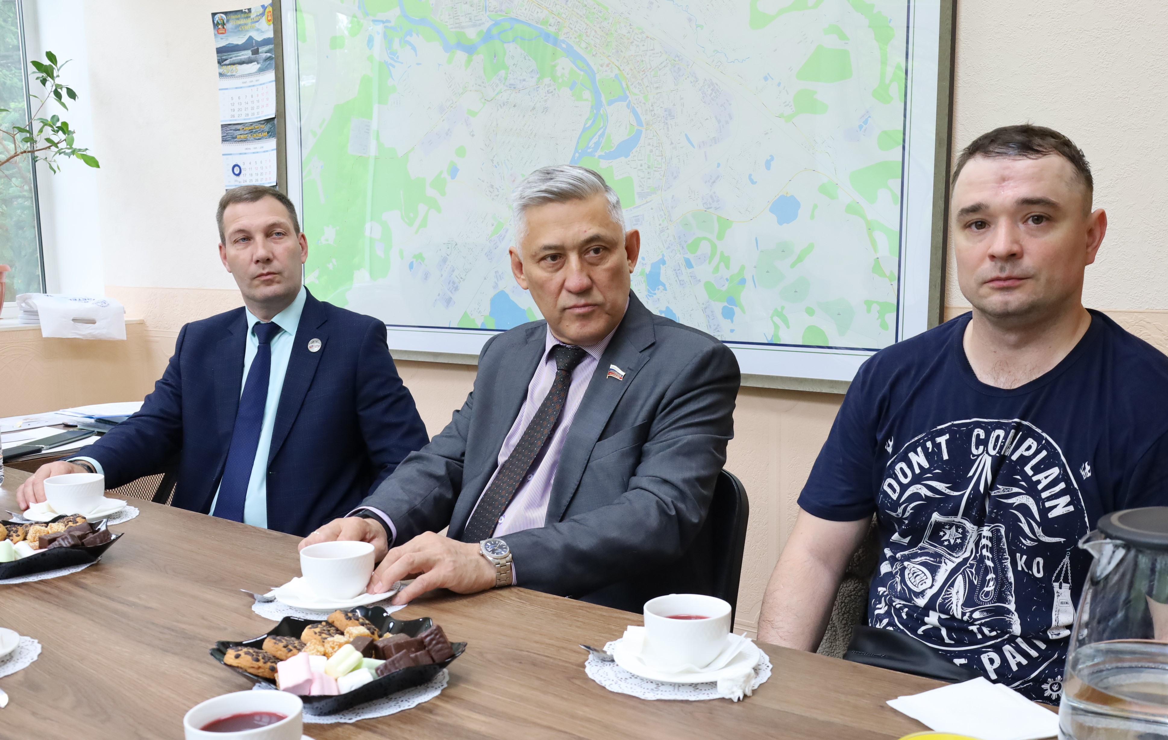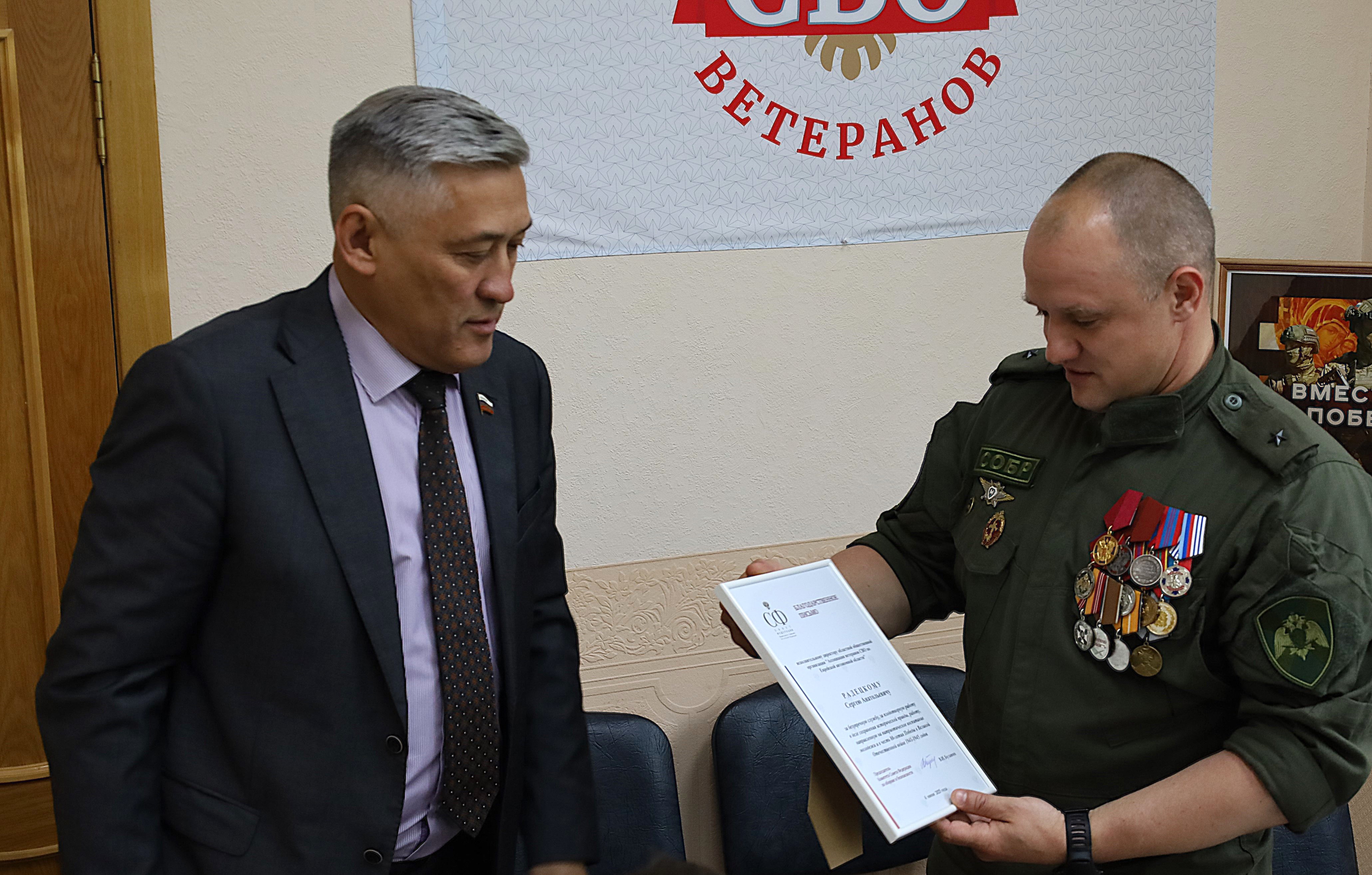 В здании городской Думы прошла встреча председателя Думы Сергея Радецкого с представителем Еврейской автономной области в Совете Федерации Юрием Валяевым. На мероприятии присутствовали активисты регионального отделения Ассоциации ветеранов специальной военной операции.